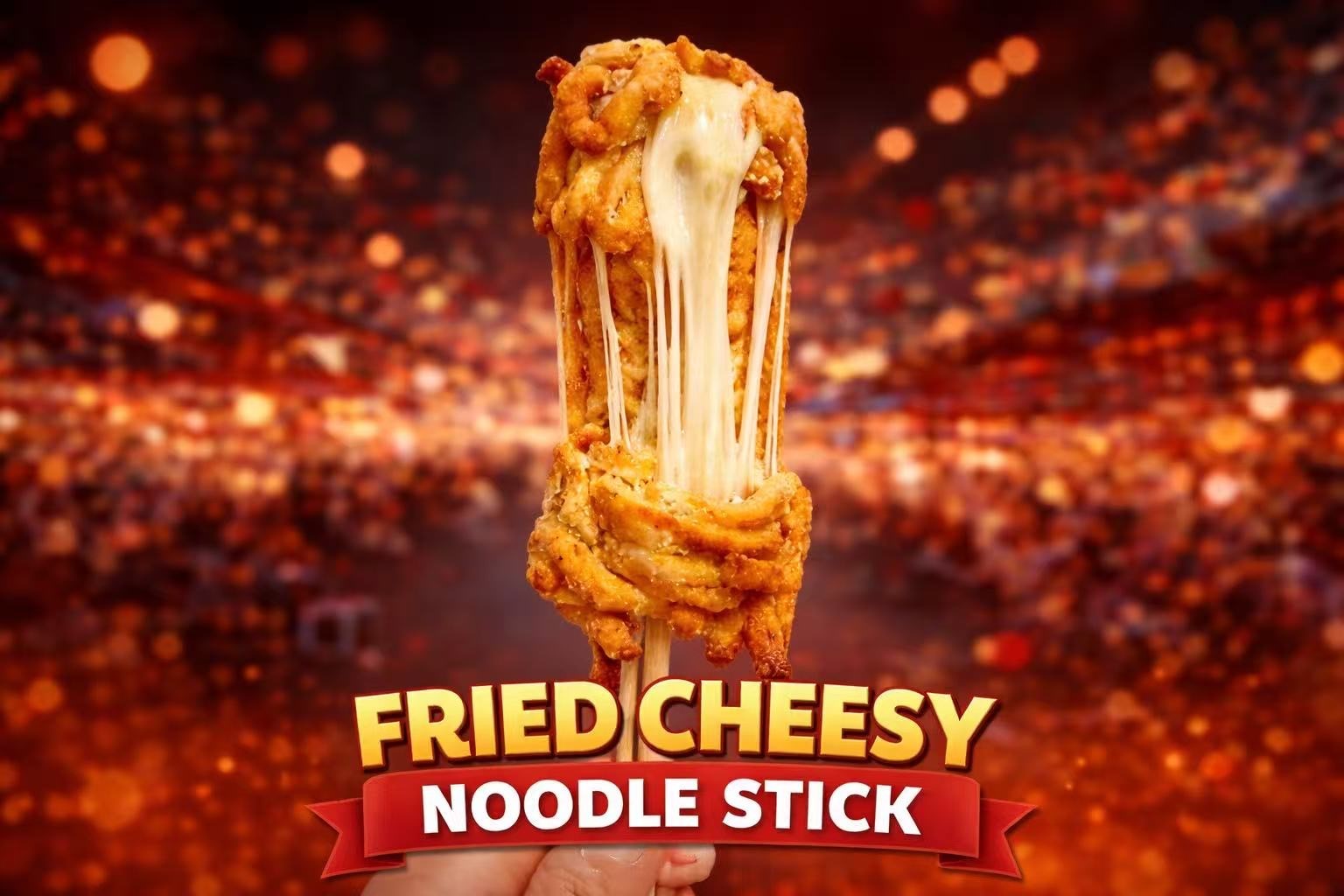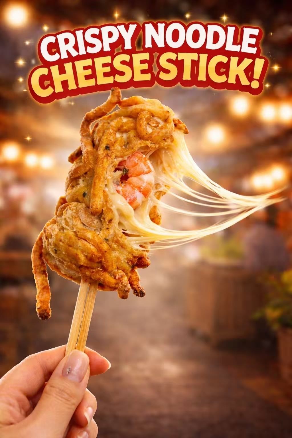 Crispy, Cheesy, Fried noodle on a stick, prawns & mozzarella cheese wrapped noodle on a stick, this uniquely created food team is tasty, easy to eat with a cheese pull.