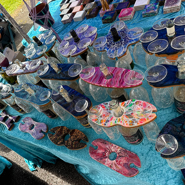 Functional art created in a home studio in Heidelberg, including acrylic-poured cheeseboards, coasters, lazy Susans, wine caddies, clocks and pots. Leftover paint skins are transformed into unique handmade jewellery, making every piece both creative and sustainable. This trader operates on a casual basis – please contact them directly for their trading days.