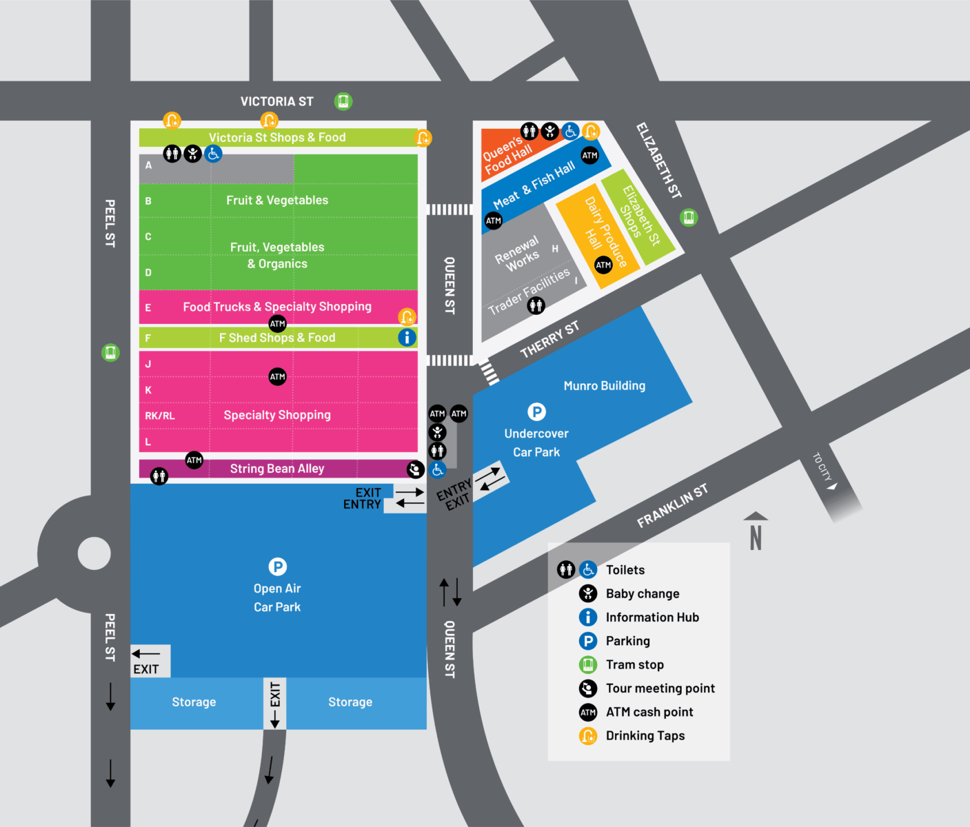 The Market is located within the free tram zone. Take the 19, 57 or 59 to Stop 7, Elizabeth Street or Tram 58 to Stop 9, Peel Street.